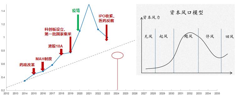 如果我们尝试将医保政策、资本市场政策、行业政策、技术变革四个因素的曲线图去做合并拟合,从生物医药周期与行业热度图我们发现,在2015-2023年这一区间,起点是2015年药政改革,国家鼓励创新,推动了行业发展,顶点是2020年,由于新冠疫情的影响,推动行业继续上行至2021年,2022年行业出现下行趋势,特别是2023年的IPO收紧和反腐政策利空,加速行业下行至今,对比资本风口模型,我们认为,当下处于停风或准备回风的阶段。