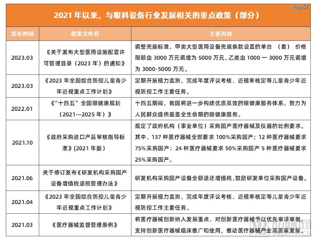 在政策层面,国家发布一系列相关文件为医疗器械的国产替代提供支持,部分政策以提高国产医疗企业创新能力为主要目标,并以提升医疗器械的审批质量、效率为重点,为实现国产替代打下基础。在这一趋势下,眼科设备领域的国产替代将持续推进。