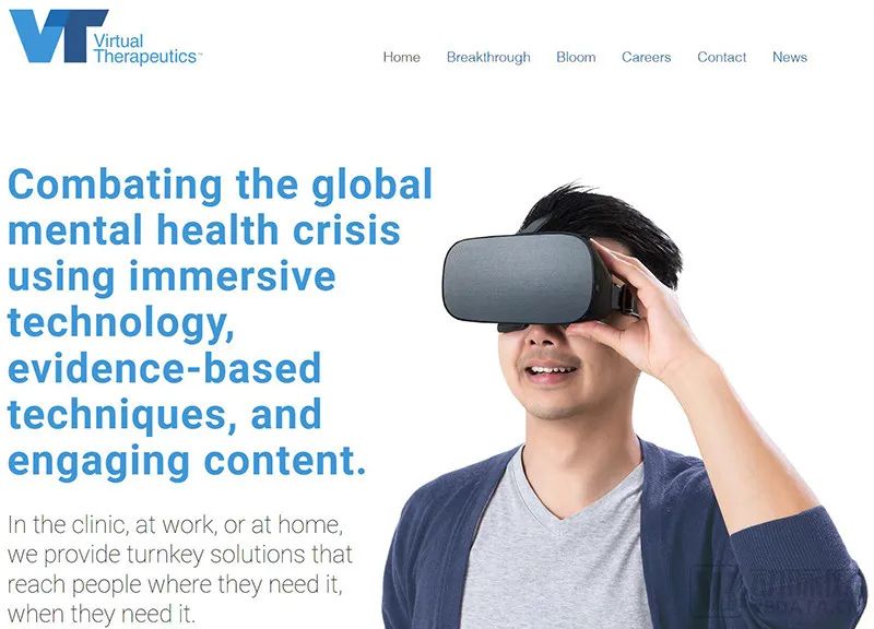 相比Akili的巨大名气,成立于2015年的Virtual堪称默默无闻,甚至历年来没有任何融资消息。从其官网来看,这是一家利用虚拟现实游戏提供心理健康解决方案的医疗企业。根据其官网的说明,Virtual提供的包含软硬件在内的Breakthrough解决方案可以明显改善企业员工的心理健康。
