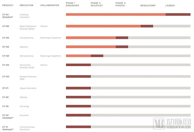 在产品管线上,Click最初的业务方向以戒烟数字疗法Clickotine为主,并在此后开拓了丰富的产品管线,如针对重度抑郁症、精神分裂症、偏头痛、阿片类药物使用障碍、多发性硬化症等一系列产品。