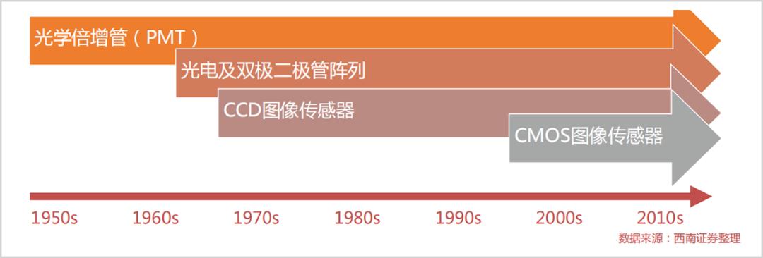 早在1873年,科学家就发现了硒元素结晶体感光后可以产生电流,由此人类正式开启了光学元件的大门。上世纪50年代,光学倍增管(PMT)诞生,人类第一次尝试将图像传感器产业化。