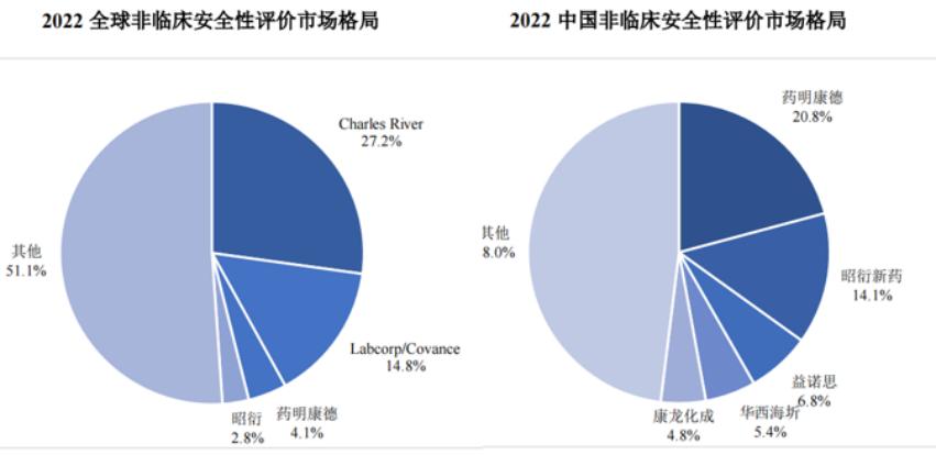 国内来看,公司在国内非临床安全性评价细分领域市场占有率排名前三,2022年的市占率为6.8%,前面两家分别是药明康德和昭衍新药。