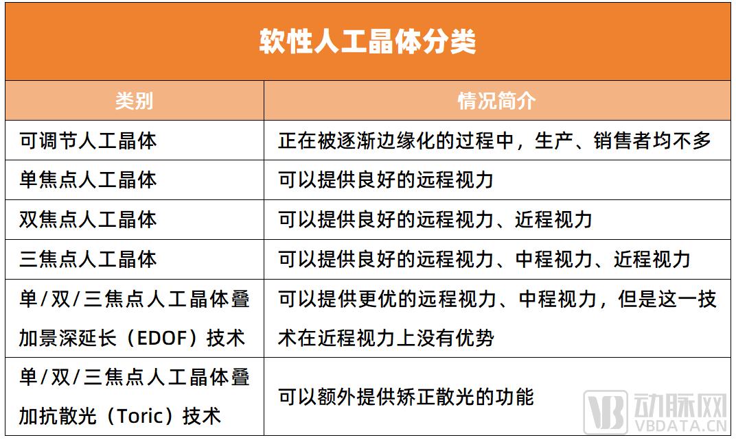 目前,常见的软性人工晶体又可细分为单焦点人工晶状体、双焦点人工晶状体、三焦点人工晶状体、人工晶状体叠加景深延长技术、人工晶状体叠加抗散光技术。其中,单焦点晶体仅能满足晶状体不再浑浊这一问题,但对于患者常见的近视、远视或者老花问题并不能解决,而双焦点、三焦点则能够为患者提供更多视程。