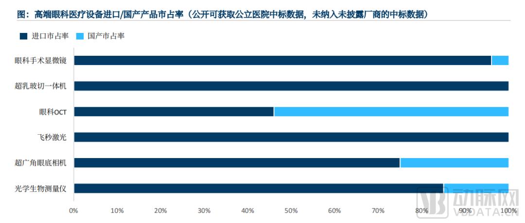 不过在供给侧,我国眼科医疗器械领域长期存在极高的进口垄断率。比如在眼科医疗设备方向,据动脉网在2021年时的调研显示,按照销售金额计算,进口眼科设备供应商的市场占比在当时高达98%,哪怕按销售数量计算,该比例也达到了90%以上。