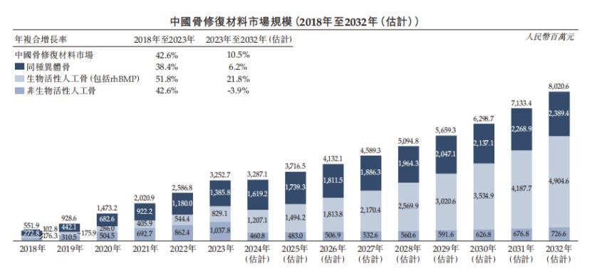 在不同类型的骨修复材料中,生物活性人工骨(rhBMP)的增长速度最快,年复合增长率达51.8%。