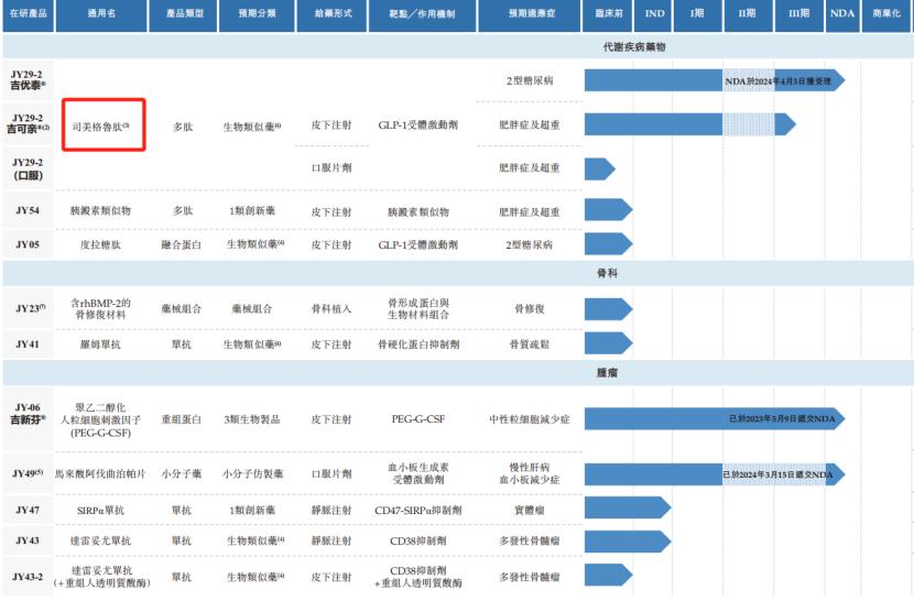 针对2型糖尿病,公司已经于2024年4月提交了JY29-2(吉优泰)的上市申请,这是中国首款取得IND批准、完成III期临床试验并提交NDA的司美格鲁肽生物类似药。