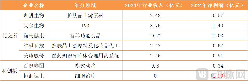 这两家企业正乘着护肤品市场下游国货品牌崛起、功效性护肤理念普及的东风,实现业绩高速增长。珈凯生物凭借在植物提取功效原料领域的领先市场份额,2024 年营业收入 2.42 亿元,同比增长 11.46%,净利润 5694 万元,同比增长 19.83%,毛利率达 63.09%。而维琪科技作为化妆品原料和化妆品成品(ODM 和 OBM)生产企业,2024 年营收 2.48 亿元,同比大增 50.23%,净利润达 6691.53 万元,同比增长 93.32%,其在多肽原料开发方面的核心技术,使其在众多化妆品原料商中脱颖而出。
