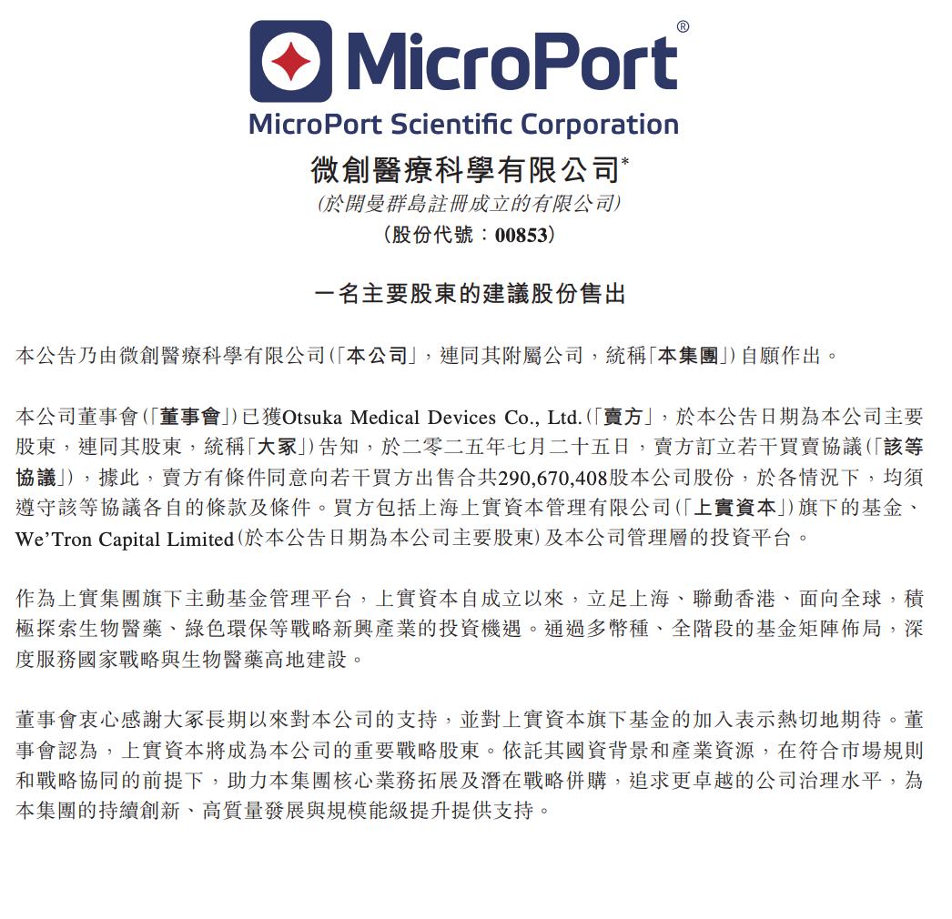 7月25日,微创医疗发布公告,公司的大股东OtsukaMedicalDevices(大冢控股)正在出售股份,拟向上海上实资本旗下基金、We’Tron Capital Limited以及公司管理层投资平台等买方,合计出售约2.91亿股公司股份。