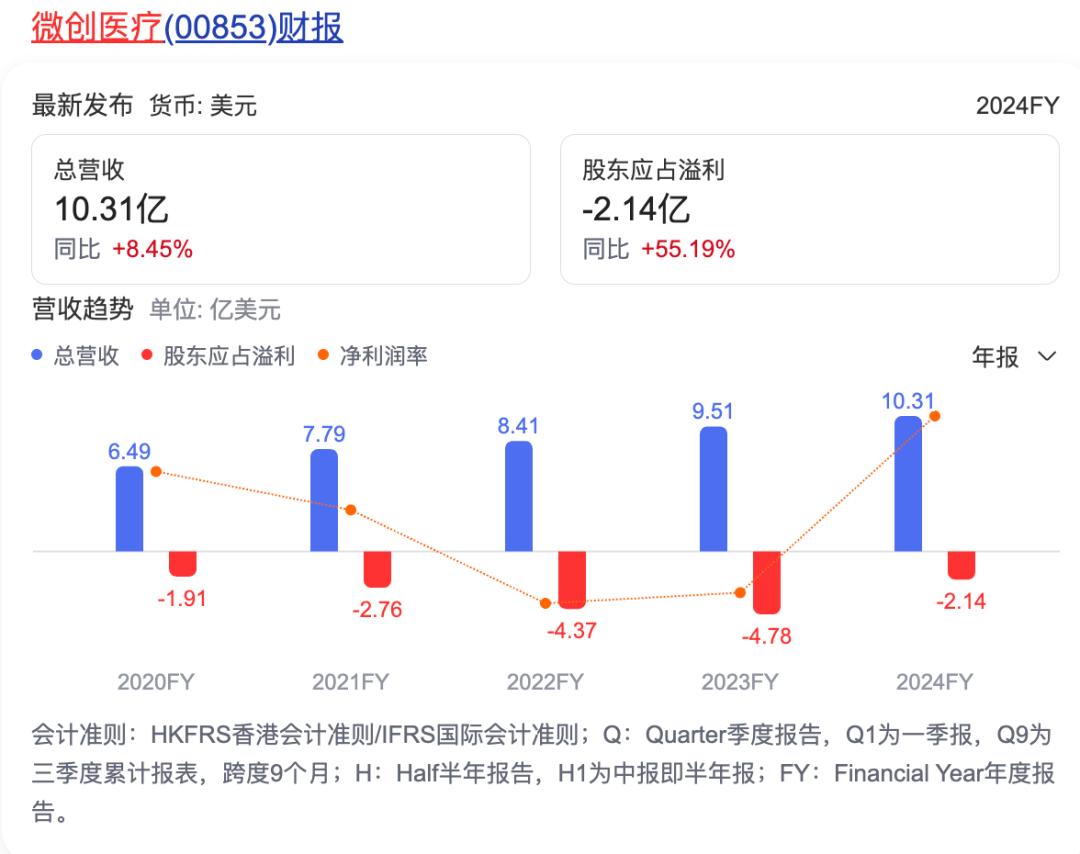 值得关注的是,2024年,微创医疗的业绩呈现出反转态势——公司收入同比增长9.6%至10.31亿美元,净亏损同比大幅收窄59%。这一改善幅度显示出公司在成本控制与业务聚焦上的明显成效。