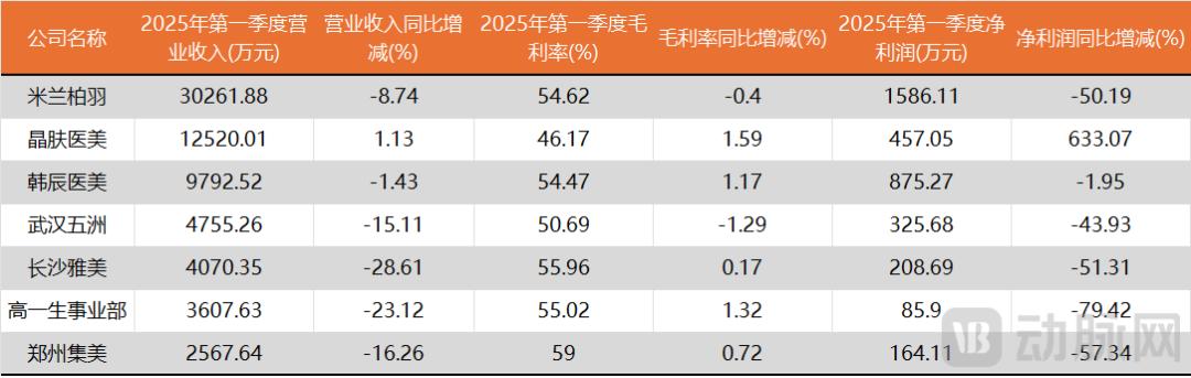 市场逆风首先吹向了中游服务机构。以朗姿股份、奥园美谷、医思健康为例,这些企业尽管旗下拥有多家综合性医院或超过数十家门诊,但业绩普遍出现下滑。以朗姿股份为例,其旗下七大医美品牌中,除了晶肤医美外,其余六个品牌在2025年第一季度净利润大幅下滑,下滑幅度几乎都超过了50%。
