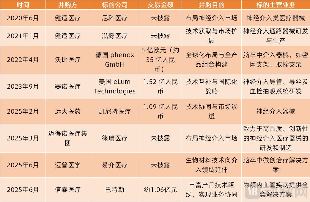 之后,迈得诺医疗集团、迈普医学、信立泰旗下信泰医疗陆续宣布收购神经介入企业。