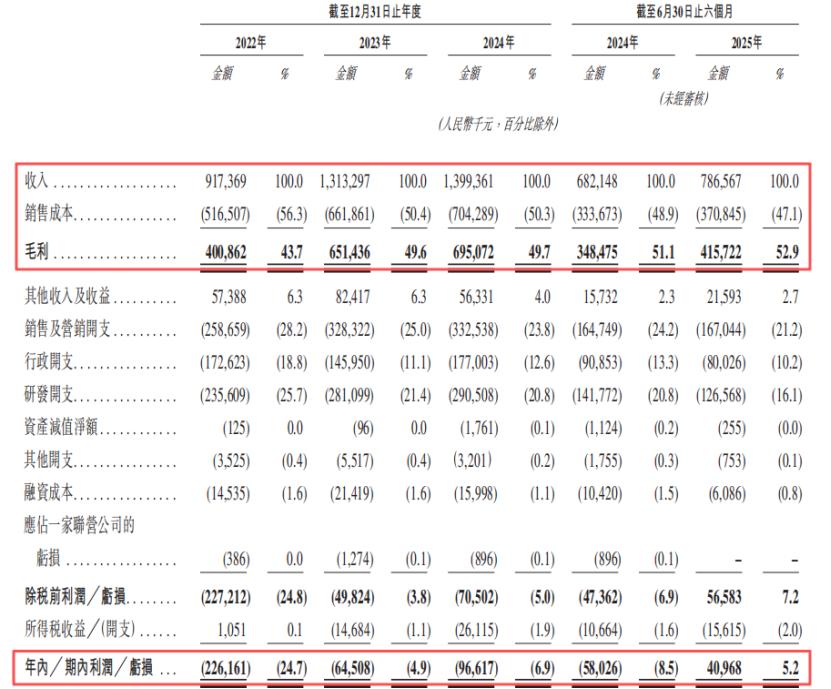 2022年、2023年及2024年、2025年1-6月(报告期),公司的收入分别为9.17亿元、13.13亿元、13.99亿元、7.87亿元,毛利率分别为43.7%、49.6%、49.7%、52.9%。