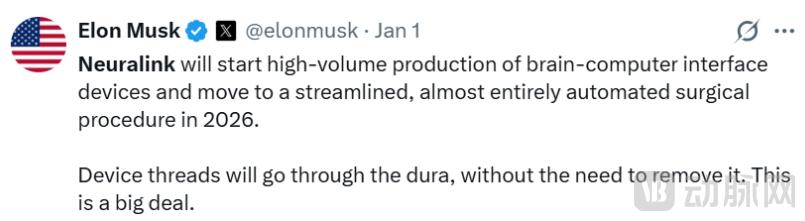 这并非没有原因,主要是与马斯克的高调“剧透”有关。美国时间2026年1月1日,马斯克在社交媒体上发文,宣布旗下Neuralink将于2026年开始对脑机接口设备进行“大规模生产”,并转向“更加精简和几乎完全自动化的外科手术流程”。2026年1月3日,马斯克再度发文,表示有信心通过Neuralink技术帮助瘫痪者恢复全身功能。