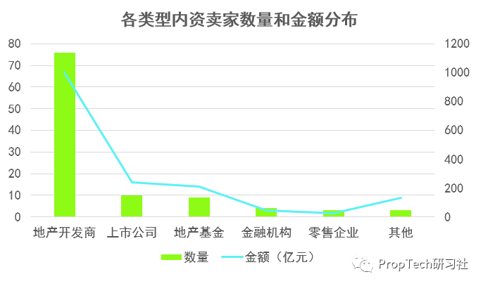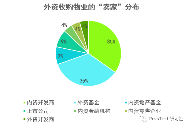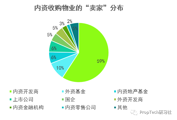 PropTech研习社发现,内外资买家的楼主要都是从内资开发商和外资基金手里买的,两类卖家的合计占比均在七成左右。