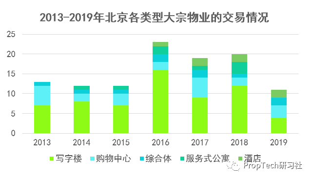 不完全统计,从2005年至今,北京大宗交易市场共发生153起交易,涉及141宗物业,物业形态包括写字楼、购物中心、酒店、服务式公寓和综合体不等。