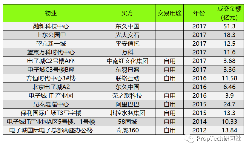 此外,活跃买家中PropTech研习社还看到了东久中国。东久中国成立于2014年,由美国华平投资集团一手打造,公司核心业务包括园区开发和运营、产业投资和基金管理。PropTech研习社发现,东久中国在北京先后买下北京文化创意大厦、北京电子城A2和融新科技中心三栋写字楼。