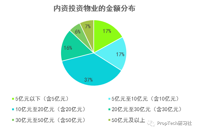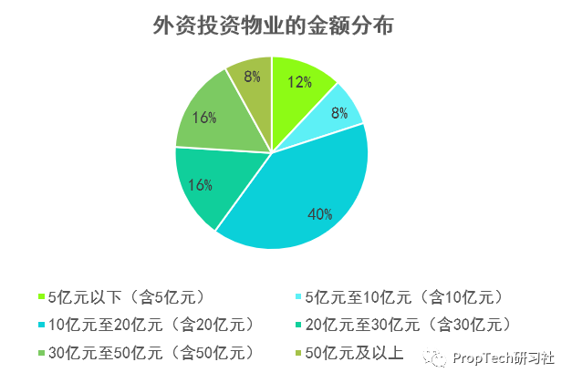 PropTech研习社发现,10-20亿元的收购标的是内外资买家的首选,这类标的占到内外资交易量的三分之一以上。和外资相比,内资七成以上的交易金额都在20亿元以下,可见内资买家更倾向于低总价的标的。
