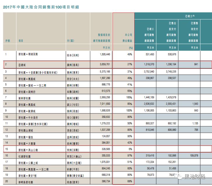 2017年年报披露的合同销售前100的项目中,碧桂园.燕山公馆,碧桂园只占有5%的权益,真正的“贴牌”项目。还有大量项目碧桂园的权益不到50%:位于广州番禺的亚运城项目,占有权益27%;位于惠州的碧桂园.十里银滩,占有权益37%;位于武汉的碧桂园泰富国际,占有权益20%;位于秦皇岛的碧桂园.首府项目,占有权益20%……