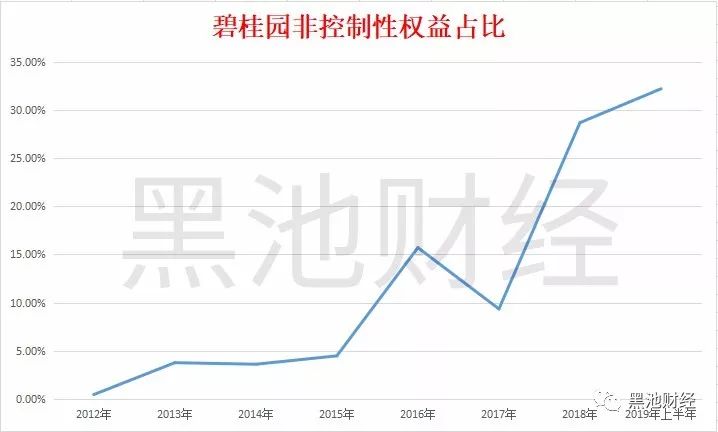 在2017年之前,碧桂园归母净利润大概占全部利润的90%以上,从2018年开始,少数股东分享的利润猛增。2017年,归属于少数股东的净利润占全部利润的10%,2018年半年报显示,非控制性权益占有净利润总数的21%,到了2018年底,这一数据上升到29%。