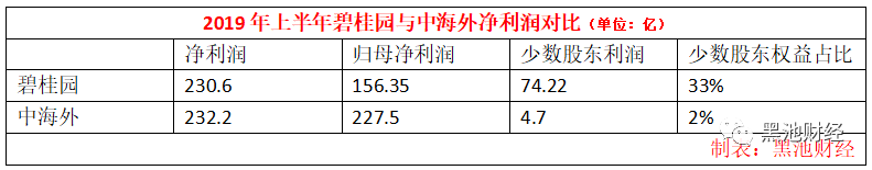 对比中国海外发展年报,2019年半年报显示,中海外2019年上半年净利润254.56亿港元(约合232.2亿人民币),非控股权益只有5.15亿港元(约合4.7亿人民币),占比2%。也就是说碧桂园与中海外的净利润相差无几,但是归属于股东的净利润,相差了70亿。
