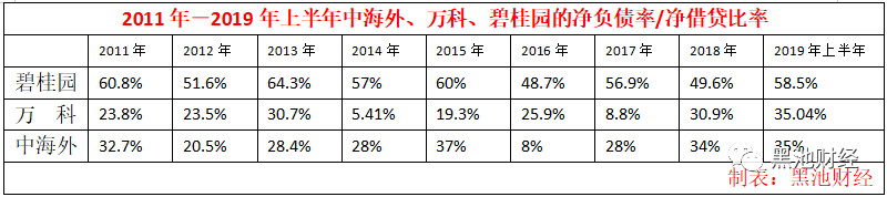 为了显示自身稳健的形象,在2019年中期报表中,碧桂园特意强调其净借贷比率从2018年中期的59%下降到58.5%,降低了0.5个百分点。其实2018年底碧桂园净借贷比率为49.6%,也就是说半年时间,碧桂园净借贷比率提高了将近9个百分点。万科今年上半年数据显示,净借贷比率为35.04%,房产企业的标杆中国海外发展上半年此数据为35%。碧桂园只有在2017年中接近这一数据,达到37.8%,之后又返回到40%以上。
