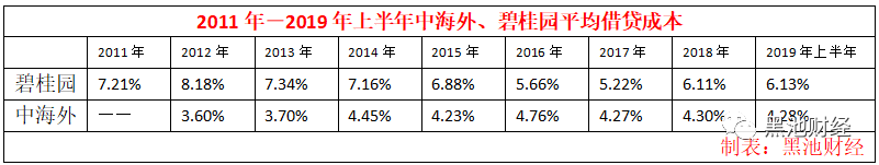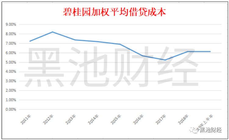 2019年半年报显示,碧桂园财务融资成本重新回到“6”的时代,上半年加权平均借贷成本上升到6.13%,同比上涨了6%,对比2017年中报数据(5.32%),这一成本已经上升了16%。