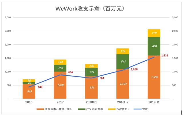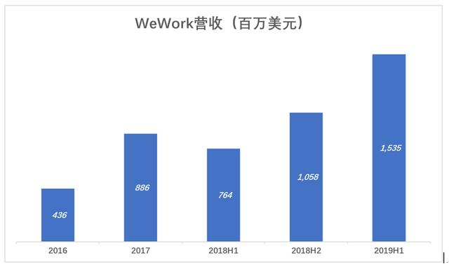 2016年,WeWork营收4.36亿美元,2017年达8.86亿,增长103%;2018年营收18.2亿美元,同比增长106%;2019年H1,营收25.35亿美元,同比增长101%。