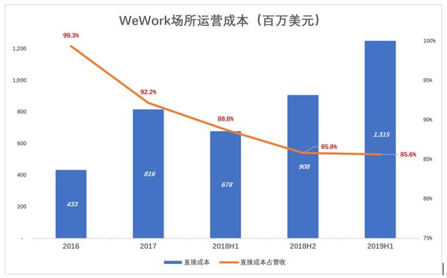 WeWork的直接成本包括“场所运营成本”(Location operating expenses,包含租金、水电费、宽带使用费及维修等)和其他运营成本。