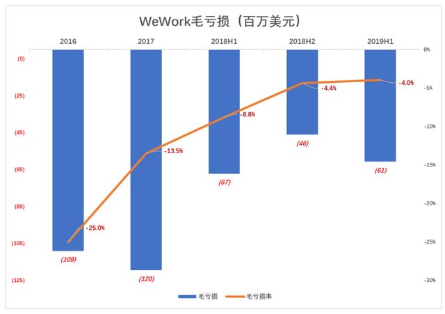 算下来WeWork毛利润一直为负,只不过进入2018年,亏损率明显收窄。