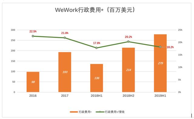 不计股权激励成本,WeWork行政费用仍然达到半年2.8亿美元(2019年H1),占营收的18.2%。发生那么多运营成本和市场费用,每年还要再花5亿美元行政管理费用,普通“二房东”不可能这样“作死”。