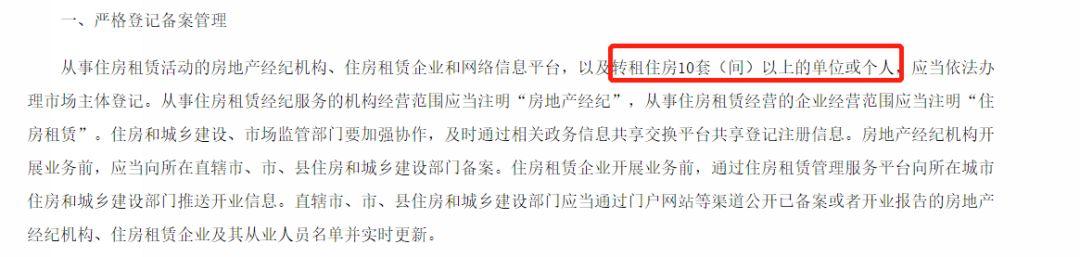《意见》指出,从事住房租赁活动的房地产经纪机构、住房租赁企业和网络信息平台,以及转租住房10套(间)以上的单位或个人,应当依法办理市场主体登记。
