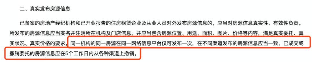 “同一机构的同一房源在同一网络信息平台仅可发布一次,在不同渠道发布的房源信息应当一致,已成交或撤销委托的房源信息应在5个工作日内从各种渠道上撤销。”