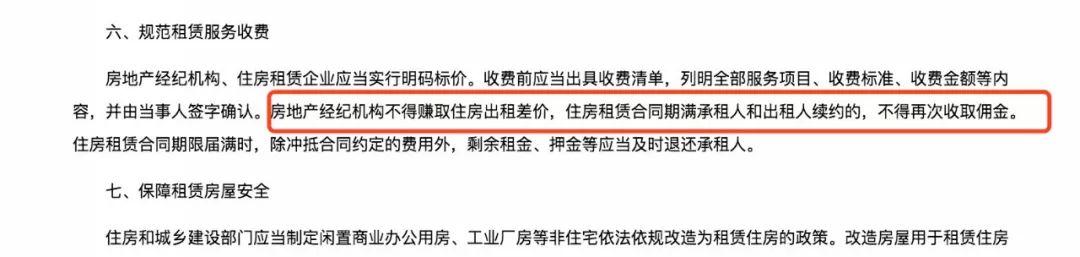 此外,《意见》 还强调房地产经纪机构、住房租赁企业应当实行明码标价。房地产经纪机构不得赚取住房出租差价,住房租赁合同期满承租人和出租人续约的,不得再次收取佣金。