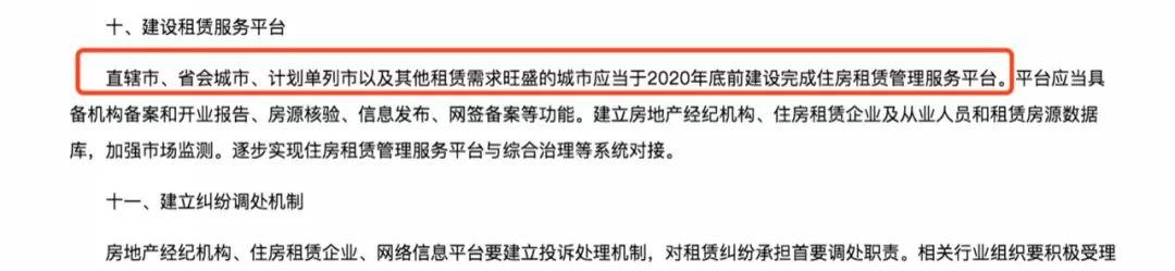 此外,《意见》还指出,直辖市、省会城市、计划单列市以及其他租赁需求旺盛的城市应当于2020年底前建设完成住房租赁管理服务平台。