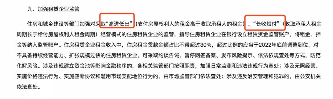 此外,住建部还表示将加强对采取“高进低出”(支付房屋权利人的租金高于收取承租人的租金)、“长收短付”(收取承租人租金周期长于给付房屋权利人租金周期)经营模式的住房租赁企业的监管,指导住房租赁企业在银行设立租赁资金监管账户,将租金、押金等纳入监管账户。住房租赁企业租金收入中,住房租金贷款金额占比不得超过30%,超过比例的应当于2022年底前调整到位。