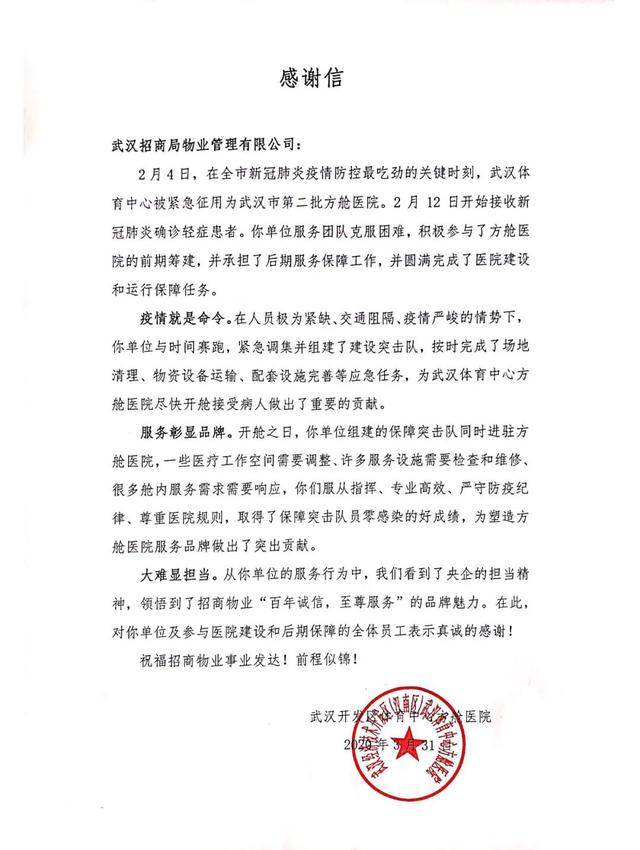 招商物业武汉公司收到的武汉体育中心方舱医院感谢信