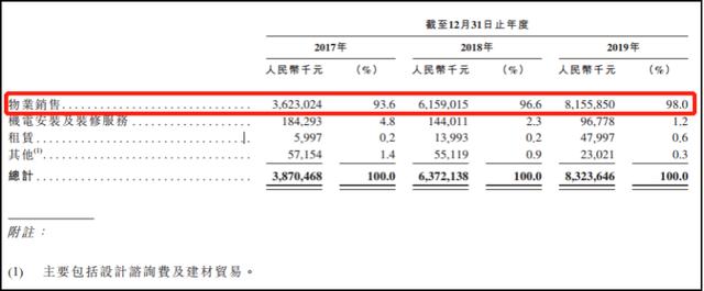 实地集团在招股书中表示,物业销售的收入过往且预期会继续占公司总收入的绝大部分。2019年,实地集团物业销售收入占同年总收入的比例升至98%。可以预见的是,这一比例还将继续攀升。