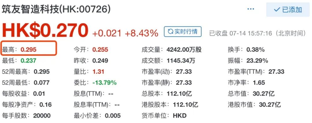 7月13日,筑友智造科技(00726.HK)发布公告称,胡葆森全资持有的恩辉投资有限公司与筑友智造科技二股东朱岳海订立一份股份购买协议,恩辉投资拟斥资现金3.03亿港元向朱岳海购买筑友智造科技约9.79亿股股份,相当于每股出售股份0.31港元。