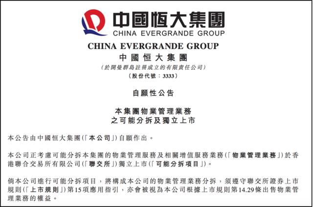 今日午间,中国恒大公告称,正考虑可能分拆本集团的物业管理服务及相关增值服务业务于香港联合交易所有限公司独立上市。