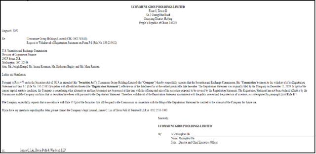 公告指出,按照1933年证券法第477条规定,Ucommune Group Holdings Limited(以下简称“ 公司 ”)特此郑重请求美国证券交易委员会同意撤销其表F-1(文件号:333-235452)上的注册声明,以及本协议的附件(“注册声明”),自本协议签署之日起生效,或在此后最早可行的日期生效。