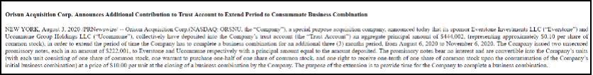 8月3日,优客工场的壳公司Orisun Acquisition Corp.发布公告称,其发起人Everstone Investments LLC(以下简称“Everstone”)和Ucommune Group Holdings LLC(以下简称“Ucommune”) 已共同向公司的信托账户存入本金总额为444,002美元(相当于每股普通股约0.10美元),以便将公司完成企业合并的期限再延长三个月,由2020年8月6日延长至2020年11月6日。