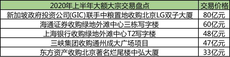 继2019年以黑石为代表的机构抄底中国商办不动产后,2020抄底第二波来袭。仅2020上半年,内地大宗交易就成交了884亿,其中北京、上海依旧是投资热土,光这两地的成交就占到了市场总额的八成,足足有700亿的交易产生!