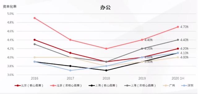 由于投资人显著提高了在北京市场的投资比例,2020年上半年,北京市场的资本化率继续领跑全国,达4.7%。