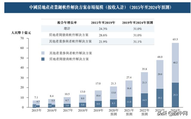 根据弗若斯特沙利文的资料,中国房地产产业链软件解决方案市场(按收入计)近年大幅增长,由2015年约71亿元增至2019年的170亿元,预计2024年将达到655亿元, 2019年至2024年的复合年增长率预计为31.0%。