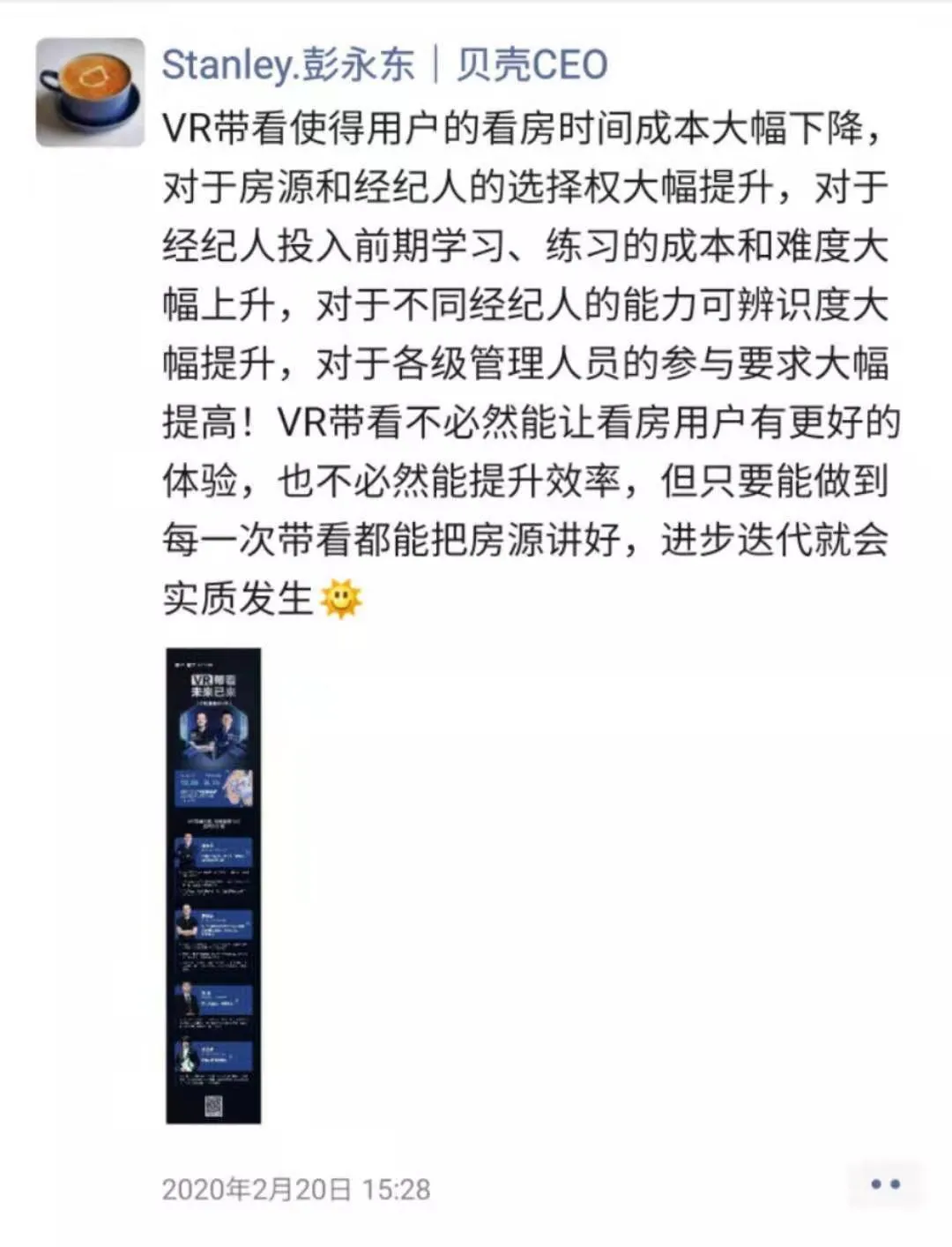 而在贝壳刚刚上线VR售楼部时,贝壳找房CEO彭永东曾在朋友圈评论道,“VR带看不必然能让看房用户有更好的体验,也不必然能提升效率,但只要能做到每一次带看都能把房源讲好,进步迭代就会实质发生。”