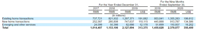 截至2020年9月30日,贝壳找房的平台上共有273家房地产经纪品牌、44,883家经纪门店和477,810名经纪人,而截⾄2020年6⽉30⽇,这三个数字分别为265、42,000和456,000。