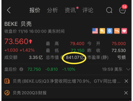 受财报业绩影响,截至11月16日收盘,贝壳找房股价涨幅1.42%,市值达841亿美元(折合约5538亿人民币),较上市首日收盘市值422亿美元翻了近一倍。