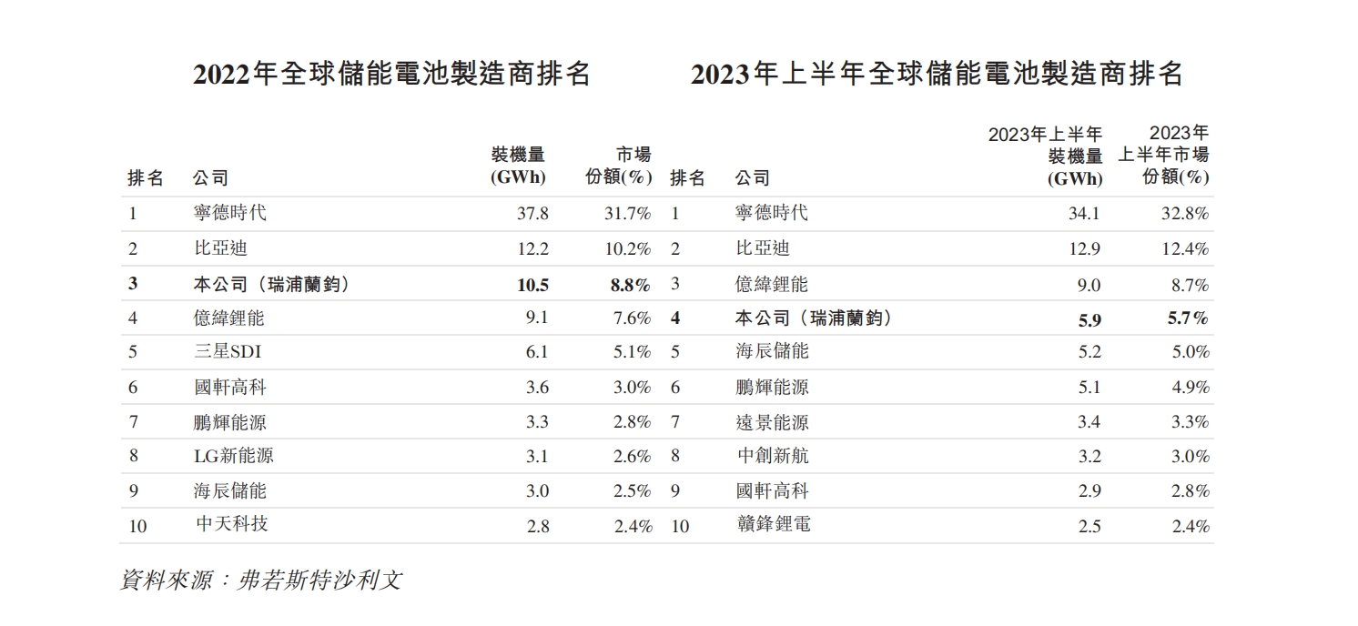 扩产的三家企业上半年市场份额均位居全球TOP5 图片来源:瑞浦兰钧招股书