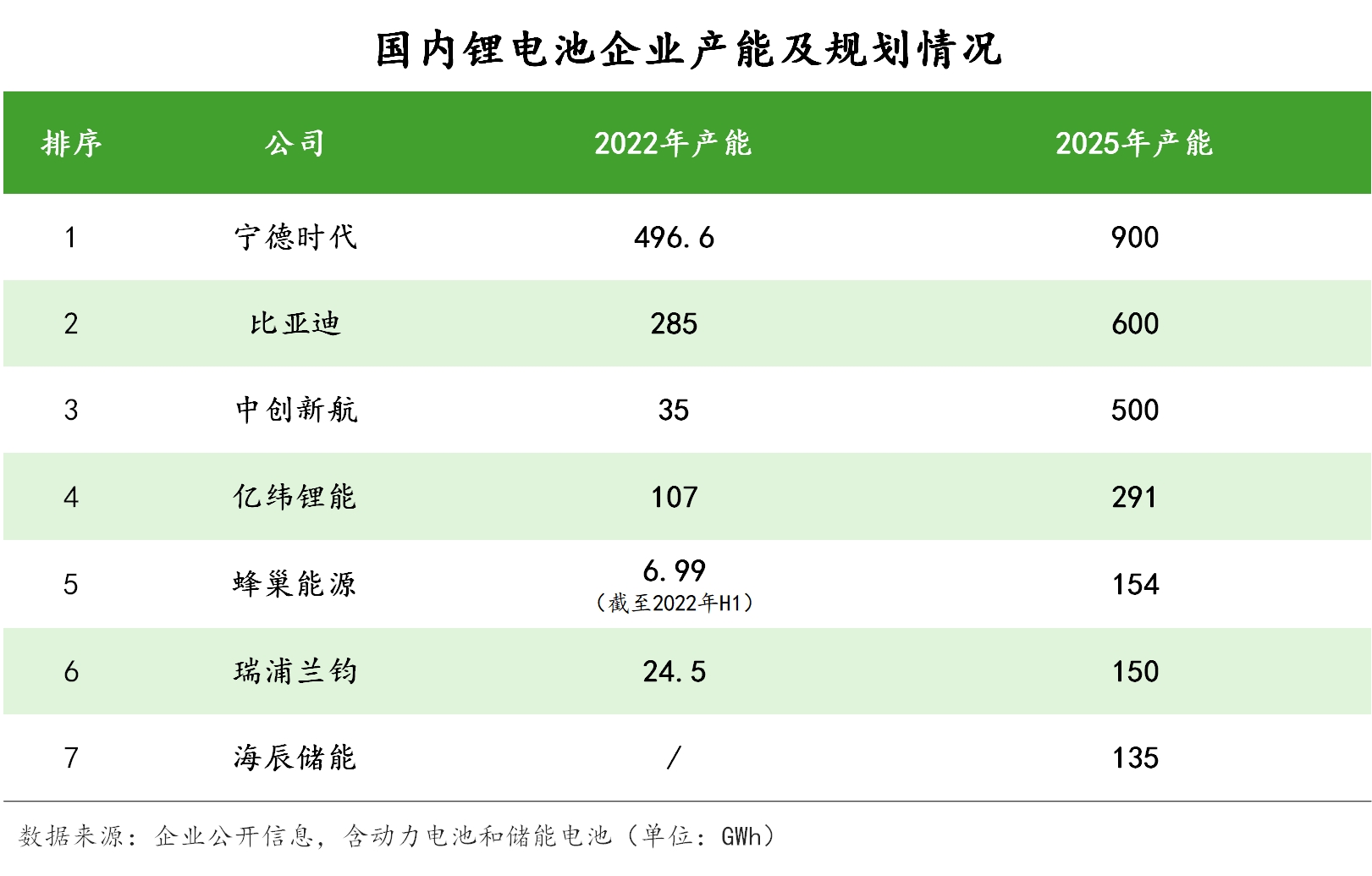 此外,宁德时代、比亚迪、中创新航、亿纬锂能、蜂巢能源等玩家也制定了很高的产能目标,他们2025年的预计锂电池产能分别为900GWh、600GWh、500GWh、291GWh、154GWh。