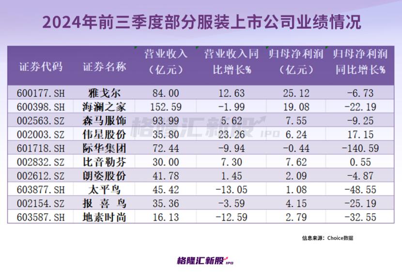2024年前三季度,际华集团、赫美集团、太平鸟、报喜鸟、安正时尚、雅戈尔、地素时尚、歌力思等企业的归母净利润都出现不同程度的下滑。